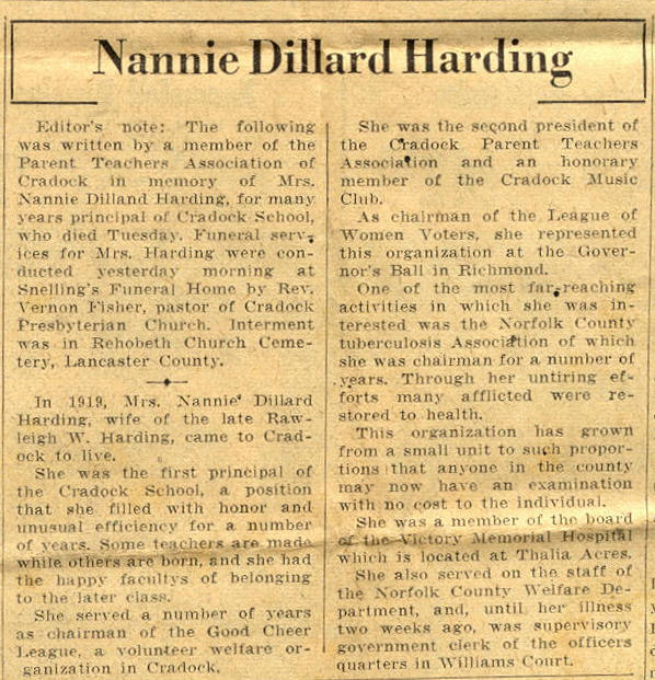 Cradock High School's first principal may have been a woman. According to the obituary for Nannie Dillard Harding, found by Curt Spear ('57) in his grandmother's belongings, this individual came to Cradock in 1919 and was the first principal. Since no yearbooks were printed before 1938 this information was not known. Mrs. Harding was mentioned in the Freed's papers, The Ship's Bell (know as A Community Named Cradock on this site) and lived first on Bainbridge Ave. then Prospect Pkwy. She was very active in the clubs around Cradock. In the 1930 census she is listed as a teacher. Wonder what other history Curt will find in his grandmother's treasurers?